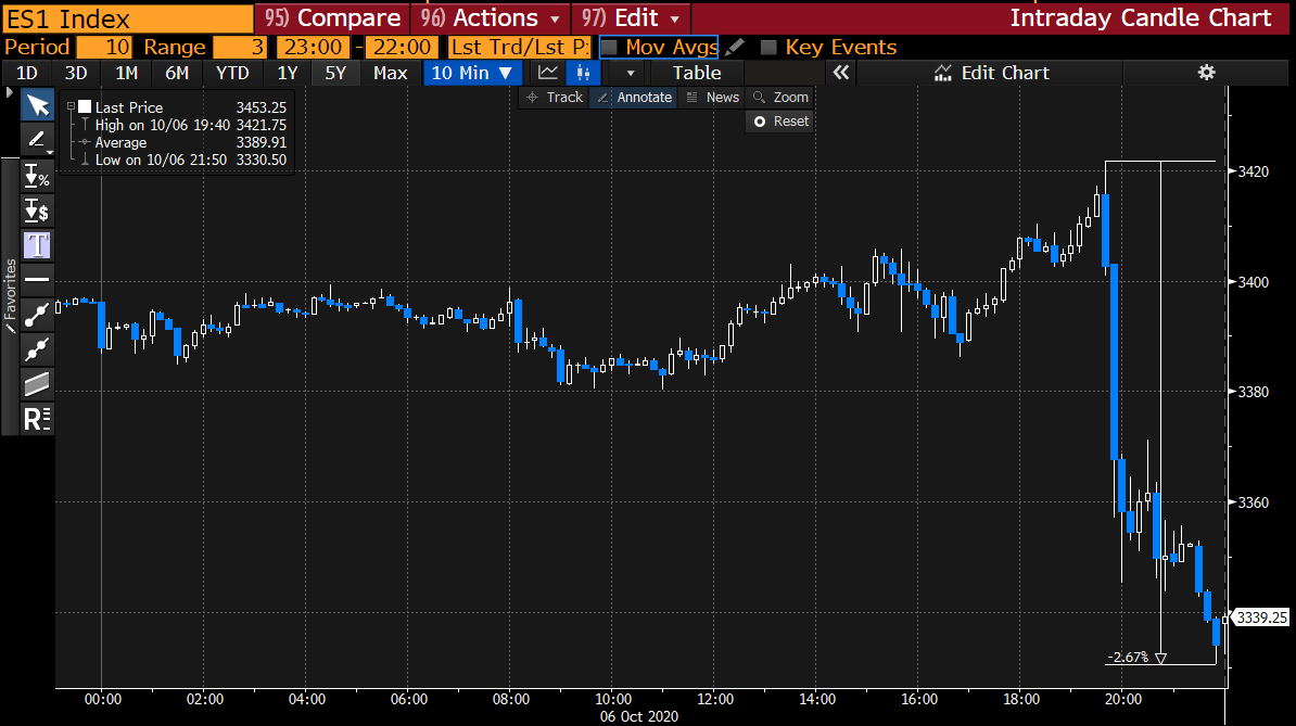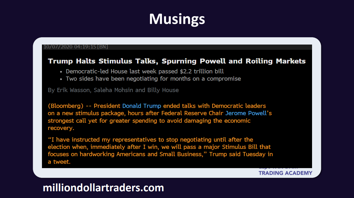 Here’s the main theme driving markets this week. Perhaps no surprise, it involves Donald Trump. The key news is that (as we correctly identified in our earlier Trading Club video analysis) investors should not expect stimulus any time soon, as Trump effectively withdrew from passing a $2.2 trillion bill to prop up the ailing US economy.